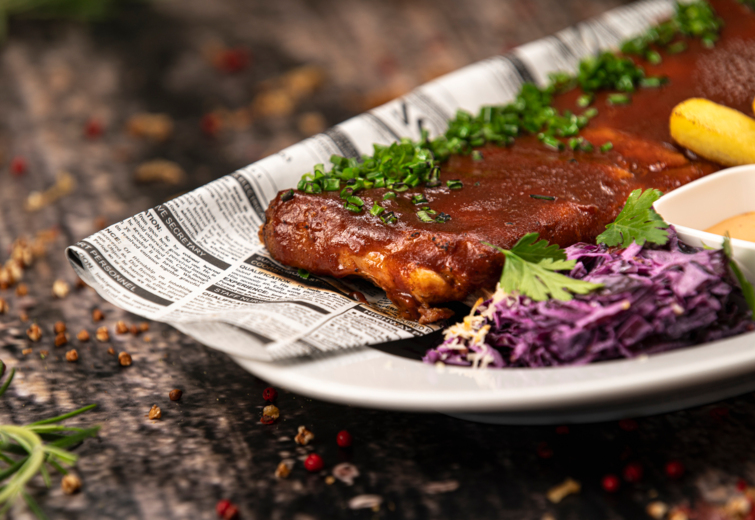 frytki / colesław z czerwonej kapusty / tarty ser wędzony / chrzan / remulada